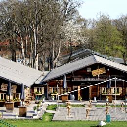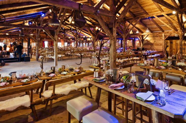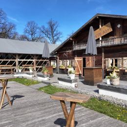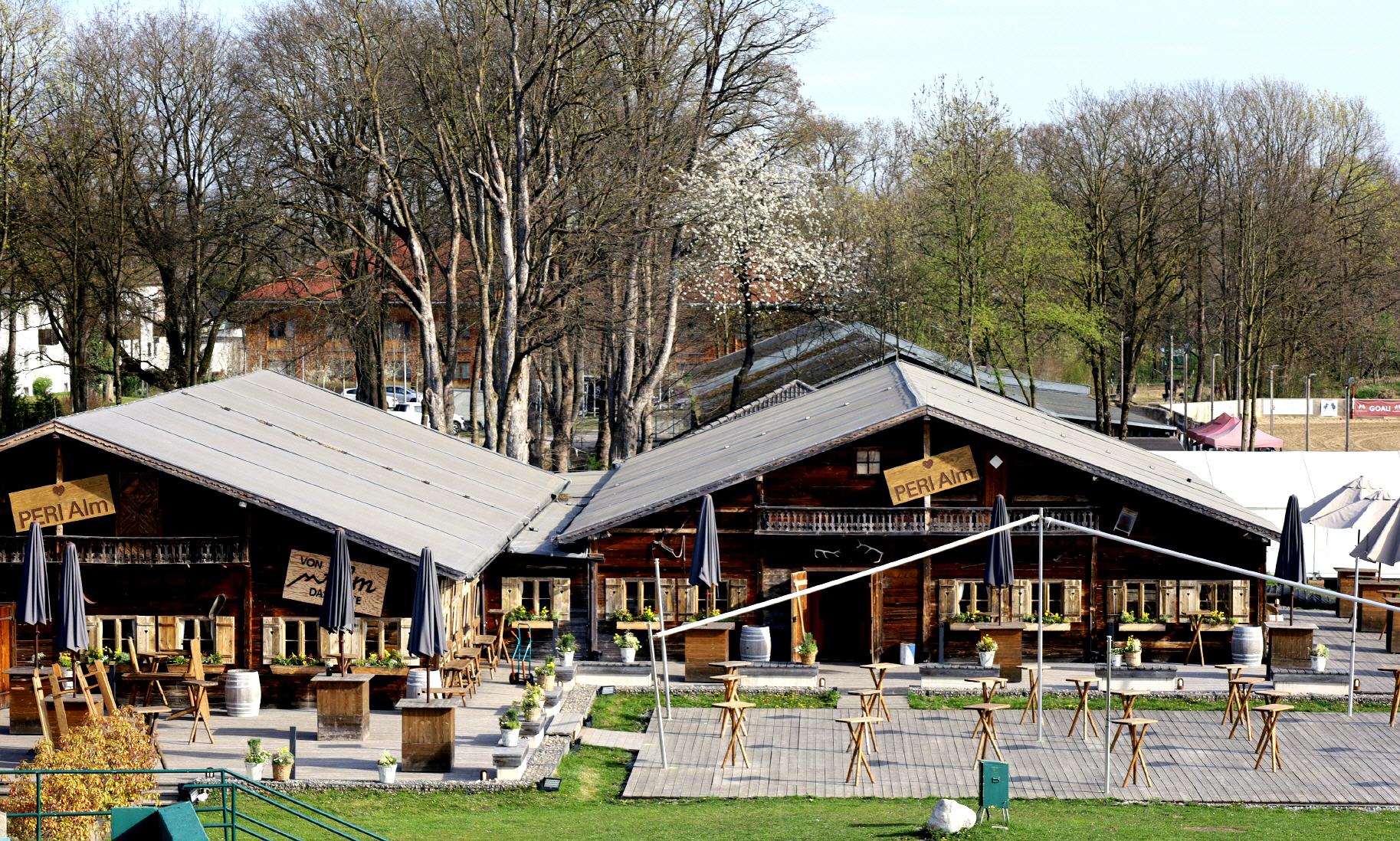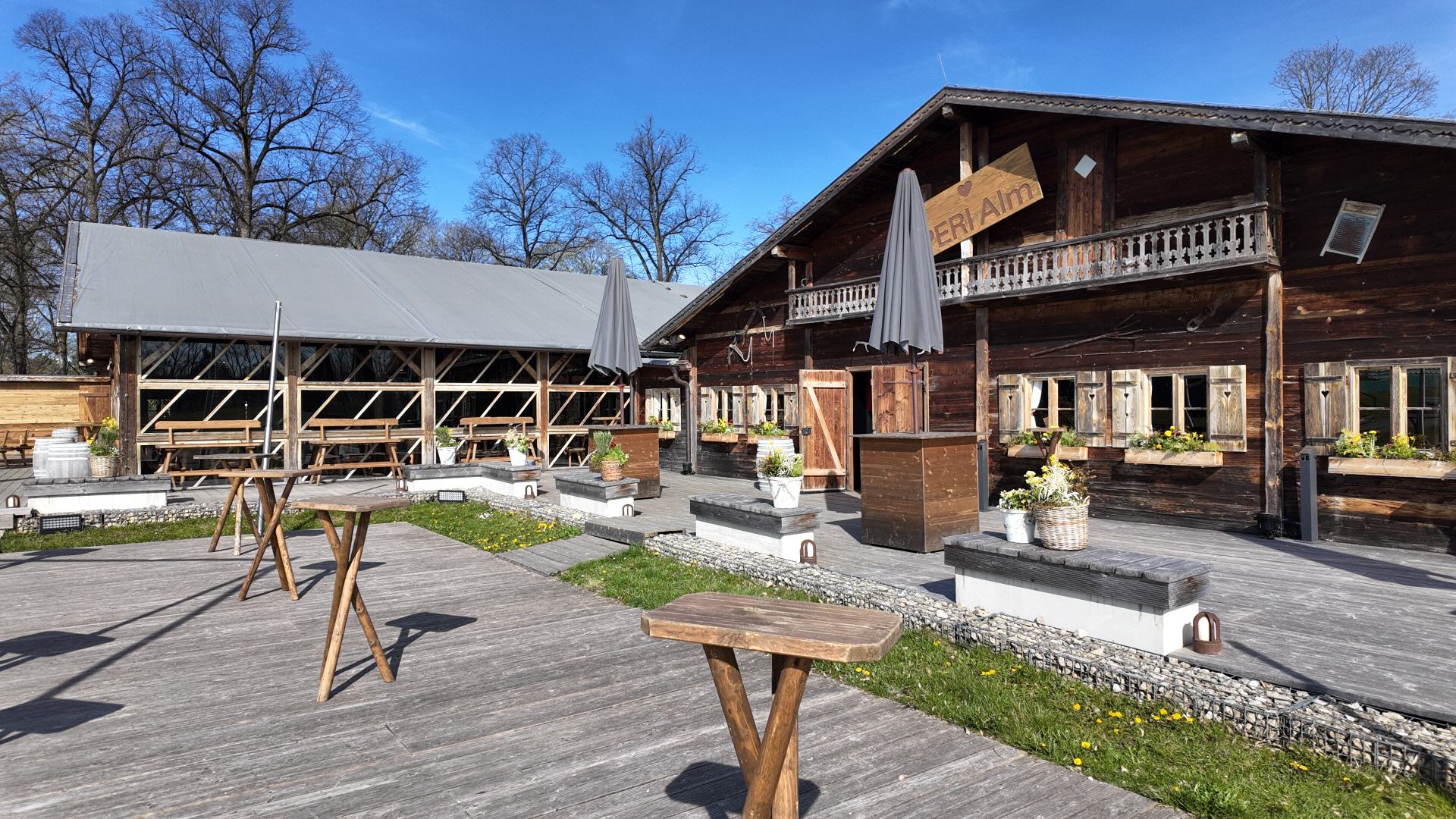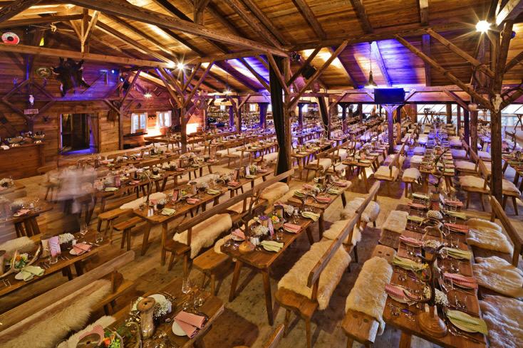 The Alm, covering an area of 900 sqm (two connected chalets, each measuring 15 m x 30 m), showcases traditional Tyrolean architecture with authentic beams, reclaimed wood, and a lovingly crafted wooden façade. This unique and versatile event venue brings genuine Alpine charm to Munich, set in a green and tranquil environment just a stone’s throw from the trade fair grounds.